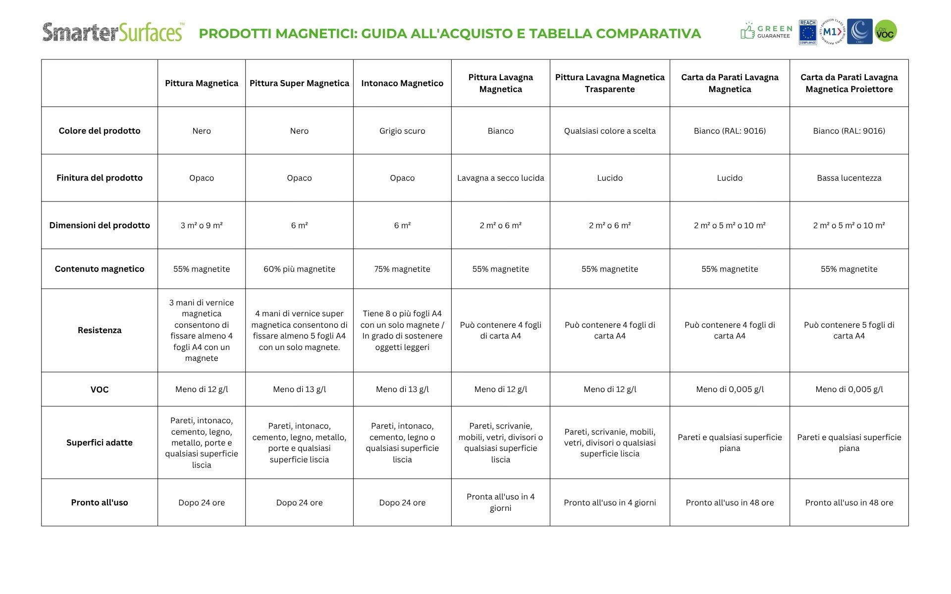 | Pittura Magnetica | Pittura Super Magnetica | Intonaco Magnetico | Pittura Lavagna Magnetica | Pittura Lavagna Magnetica Trasparente | Carta da Parati Lavagna Magnetica | Carta da Parati Lavagna Magnetica Proiettore | |